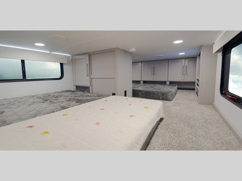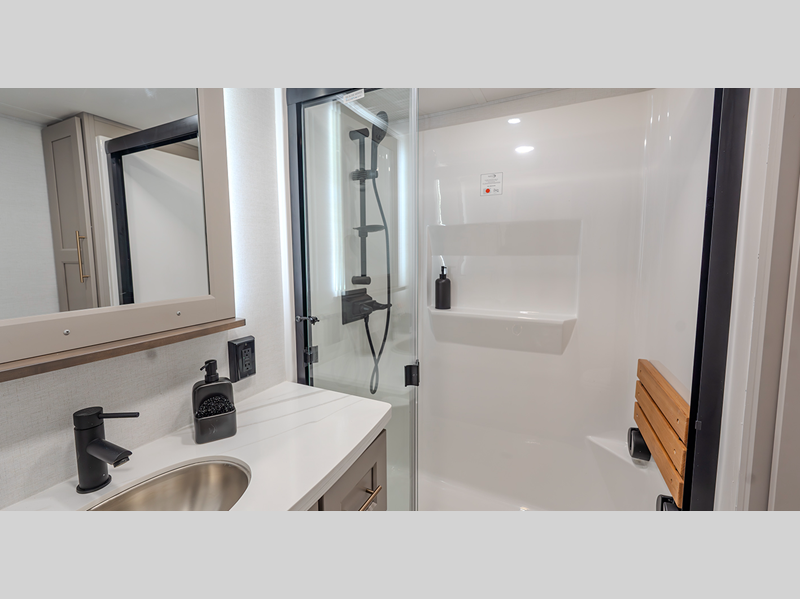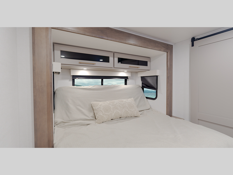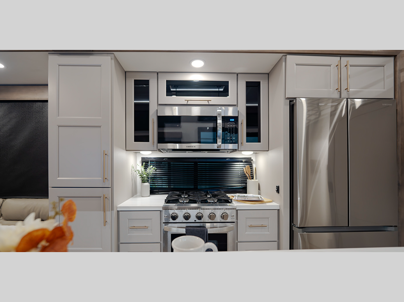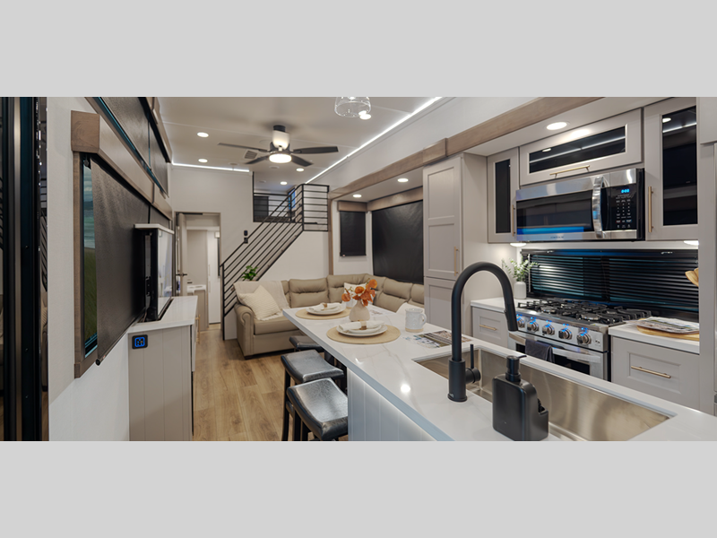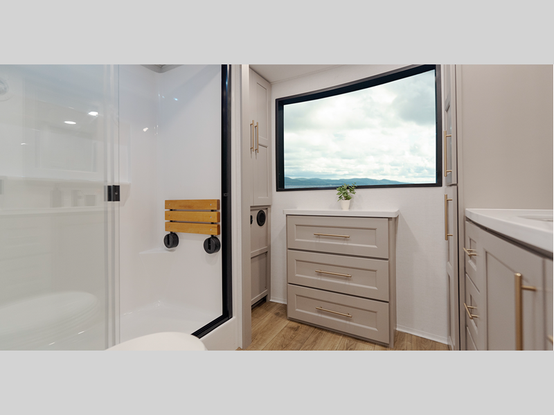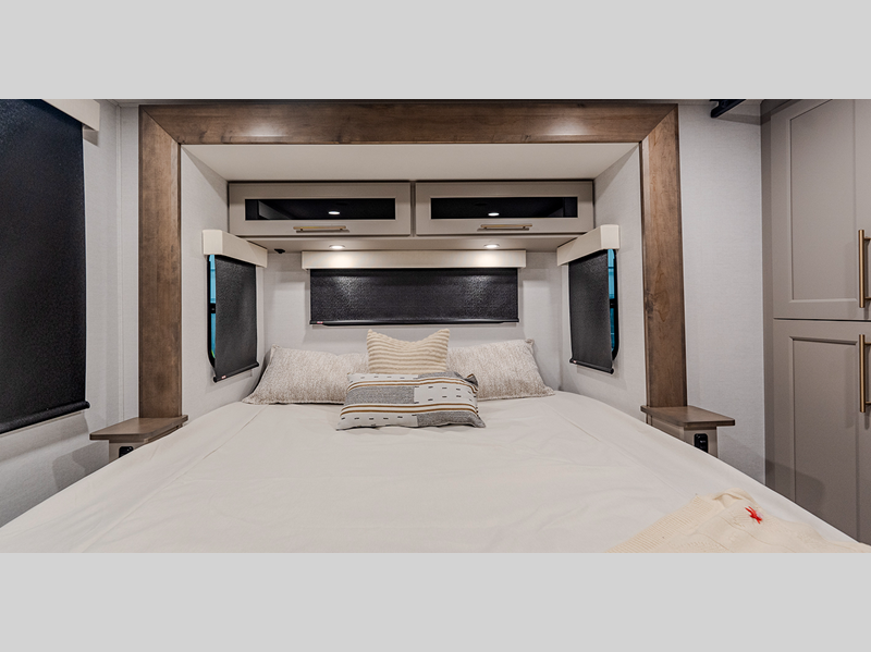 Inside, you'll enjoy residential features, such as solid surface countertops throughout, hardwood cabinetry, dimmer lights throughout, and day/night shades with power blinds for the upper window. Each model is built with Azdel composite fiberglass sidewalls, along with a high gloss fiberglass exterior and oversized atrium windows to let natural light in.
