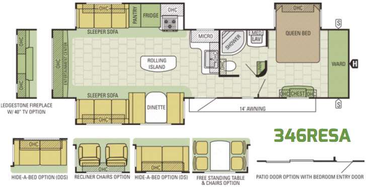 Some of the options that you can choose are a free standing dinette with chairs, hide-a-bed sofa, recliner chairs, and of course the Ledgestone fireplace with 40" TV above.